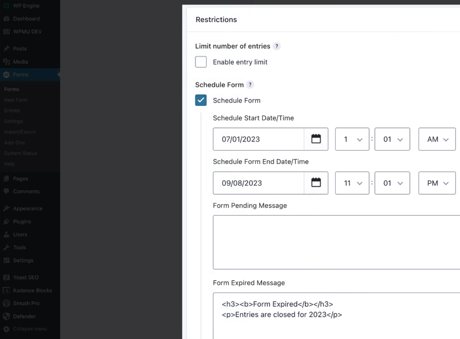 Due to a user friendly interface embedded directly in the Gravity Forms dashboard, limiting access, avoiding scheduling issues, and controlling time based availability is easy. It is a plain, strong method of making your forms correct, professional and less stressful.